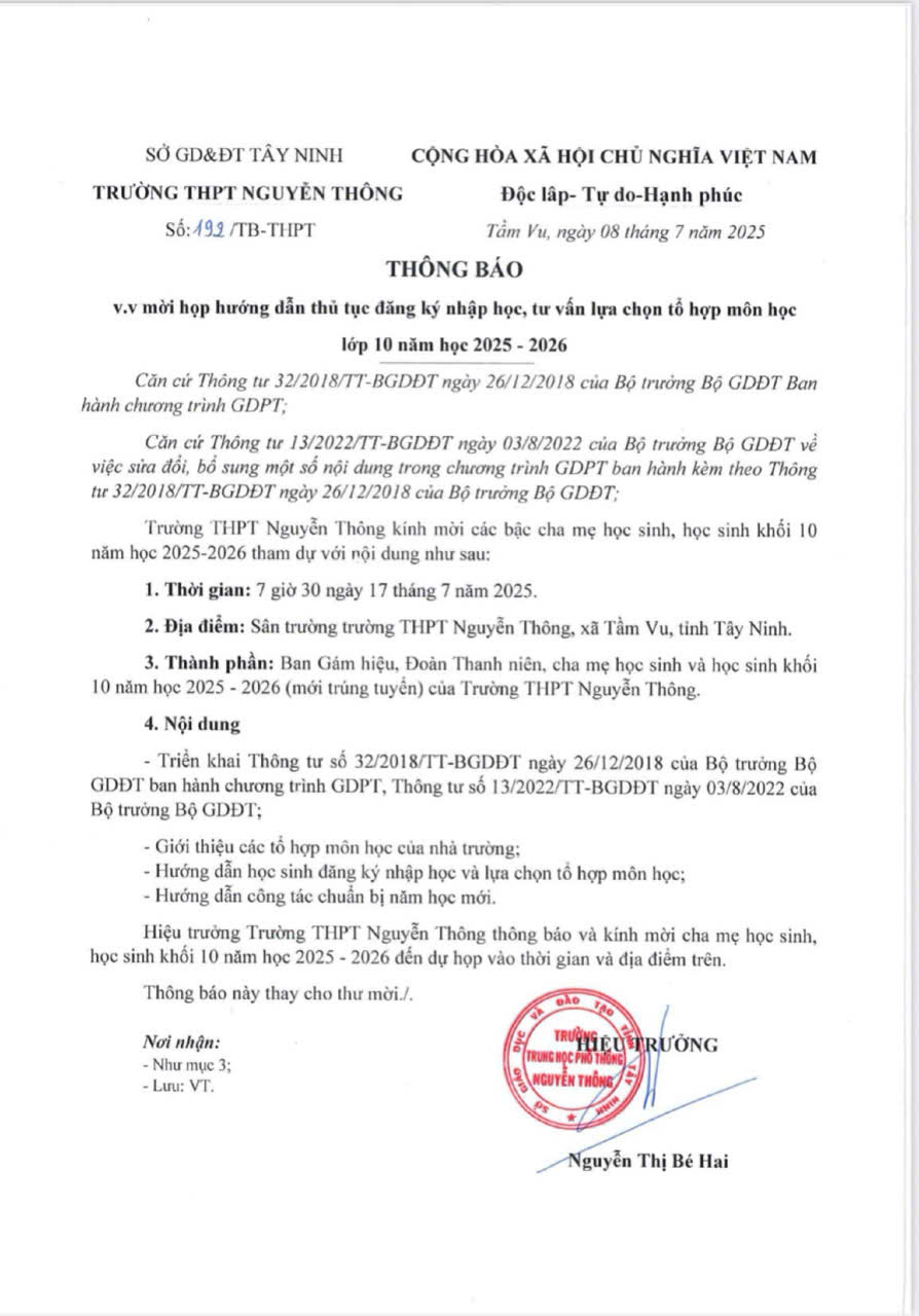THÔNG BÁO: MỜI HỌP HƯỚNG DẪN THỦ TỤC ĐĂNG KÝ NHẬP HỌC, TƯ VẤN LỰA CHỌN TỔ HỢP MÔN LỚP 10 NĂM HỌC 2025-2026